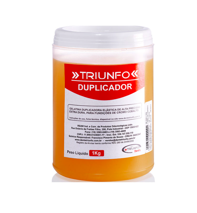 * Modo de usar:- Cortar o duplicador Triunfo em pequenos pedaços de 1 cm.- Aquecer em fogo baixo durante o derretimento, mexer com uma colher de madeira mantendo a homogeneidade.- Prepare o modelo de gesso a ser reproduzido na mufla especial para duplicação em PPR.- No momento em que o duplicador Triunfo estiver a mais ou menos 45 ? invertê-lo na mufla para realizar a cópia.- Após a gelificação, retirar o modelo da mufla e derramar o revestimento no molde, no qual será fundida a PPR em cromo cobalto.* ATENÇÃO: na reciclagem do duplicador Triunfo recomenda-se a adição de água, para manter a fluidez do produto, a cada 3 usos.* Evite fervê-lo.* Pode ser usado em micro-ondas.* Composição: Agar-Agar, Glicerina, Conservantes e Água.* Derrete em temperatura maior que 70°C, tornando-se um líquido com baixa viscosidade.* A viscosidade baixa é importante para a reprodução dos detalhes