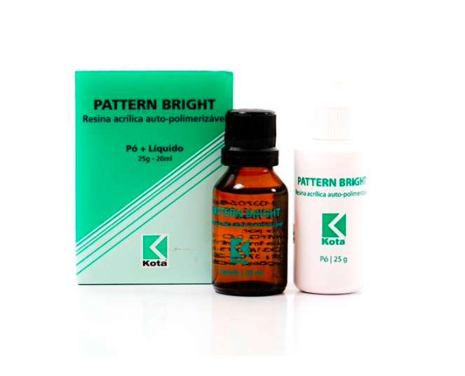 O Kit Resina Acrílica Pattern Bright da Kota é autopolimerizável e indicado para a fundição de copings, núcleos, coroas e soldas. Se destaca por sua alta resistência, que resulta em melhor definição das margens e outras áreas finas e por sua excelente adaptação, graças à mínima contração do material.